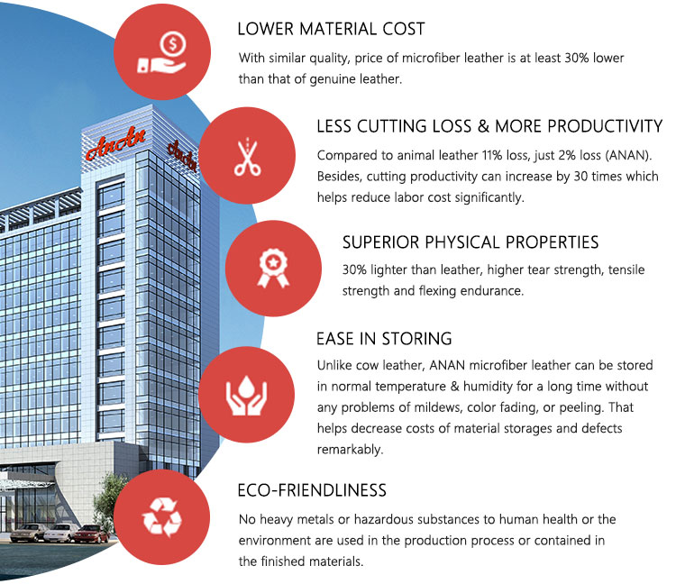 ANAN (CHINA) CO., LTD is a leading microfiber leather producer and PU Leather Exporter based in China. This PU synthetic leather supplier company was established in the year 2008 and has grown as a specialized producer of top quality microfiber synthetic leather for various industries such as bags and leather goods, shoes and high performance materials for the fashion industry. The main products that ANAN offers include PU synthetic leather, microfiber non woven base and microfiber synthetic leather. All the microfiber leather produced at ANAN complies with the latest requirements of the EU REACH chemical regulations.
